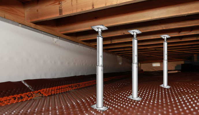The purpose of steel crawlspace floor-support jacks is to provide positive support to the sagging floors above crawl spaces and to assist in eliminating the bouncing or squeaking caused by weak support. This supplemental support system has an ultimate capacity of 60,000 pounds. Furthermore, it is used where current column supports have failed.
